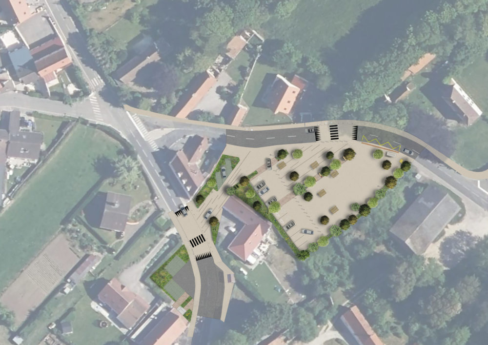 La place est conçue pour s’articuler avec les interstices du village, en favorisant un usage partagé et une végétalisation maximale, tout en maintenant les différentes dessertes riveraines.